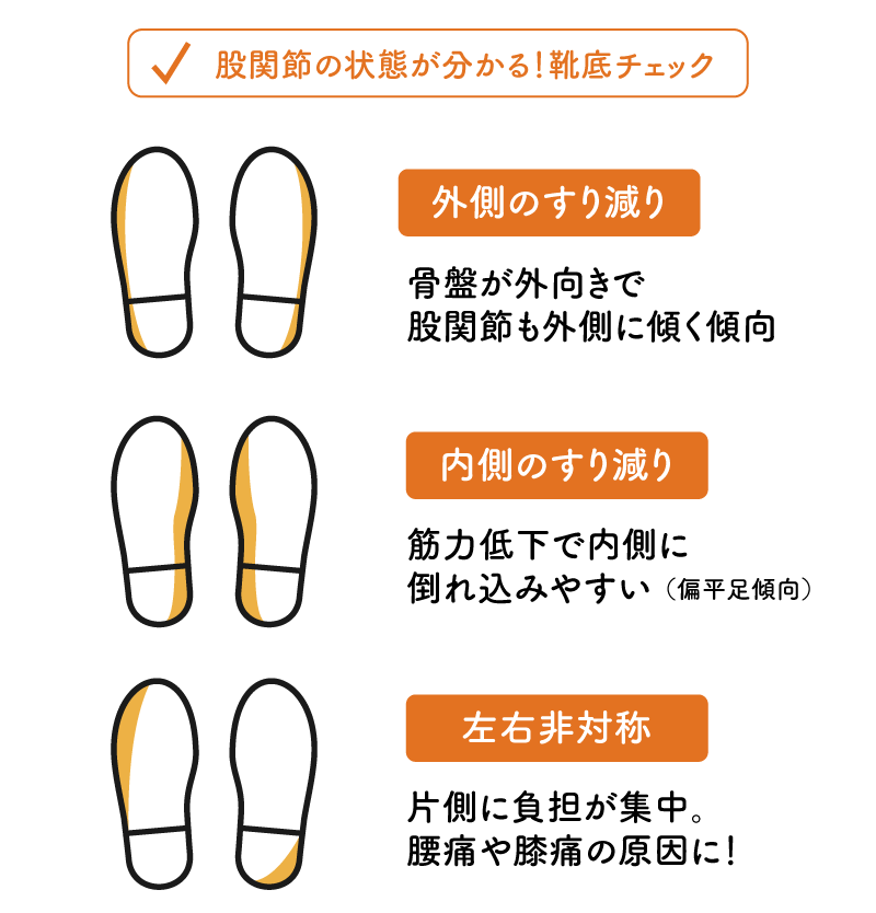そこでまず試したいのが、靴底チェック。かかとの外側だけ減っていたり、左右で減り方が違ったりしませんか? これは股関節の使い方に偏りがあるサインです。
